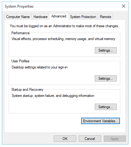Now in the new window that comes up, select Environment Variables... at the bottom.