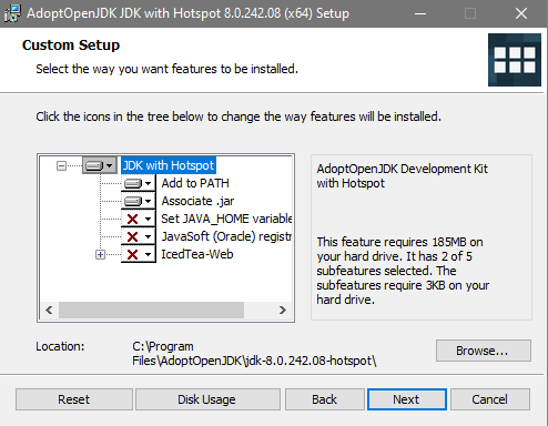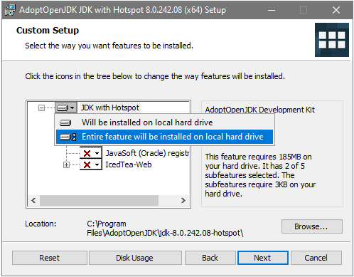 Go to https://adoptopenjdk.net/ and download the latest release of OpenJDK 8, by clicking on the latest release Button. After downloading, run the installer and click next till the Custom Setup screen is shown: