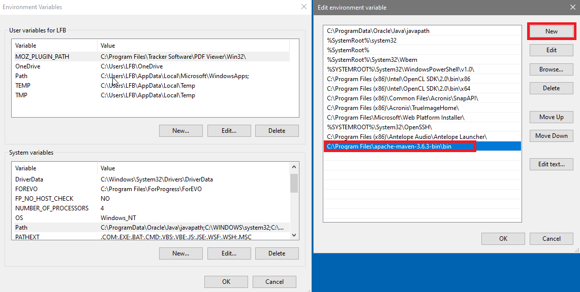 The “Edit environment variable” UI will appear. Here, you can click “New” and type in the path to the Maven bin directory (in this case C:\Program Files\apache-maven-3.6.3\bin).